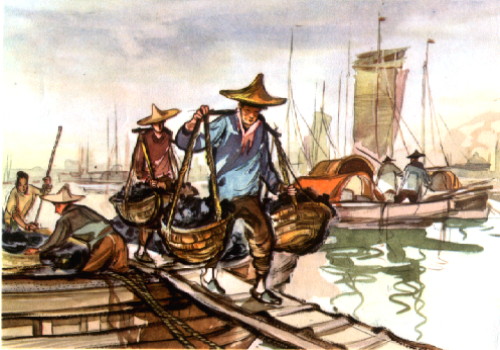 Nanking. Zu guter Letzt hätte Tom beinahe noch den Zug verpaßt. Die Rückgabe seines Gepäcks bei der Aufbewahrung dauerte Ewigkeiten. Das wäre eine schöne Geschichte gewesen, sein Vater zum verabredeten Zug auf dem Bahnsteig, und Tom noch einmal verlorengegangen. Er schwitzt nicht wenig, als er wieder einen Platz gefunden hat und sich über seinen Eßkorb hermacht. Drei Stunden am Kaiserkanal entlang. Oft trennt nur der mit Steinplatten belegte Treidelpfad den Wasser= und den Schienenweg. Weiß leuchtende und zerrissene schmutzige Dschunkensegel blähen sich im Wind. Meisterwerke uralter Baukunst sind die Granitbrücken, die den Kanal überspannen und den Schiffen halbmondförmige Durchfahrten freilassen. Allerdings haben die alten Brückenbauer noch nicht an beräderte Fahrzeuge gedacht. Über die Stufen der Brückenbögen gingen Jahrhunderte lang nur Fußgänger, Träger trugen Sänften hinüber. Jetzt versuchen auch Rikschas hinüberzufahren. Für Autos müssen breitere Brücken gebaut werden. Tom sieht immer häufiger auf seine Uhr. Zwei Stunden vor Nanking biegt der Kanal zum Jangtse hin ab. |
