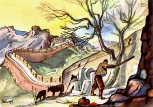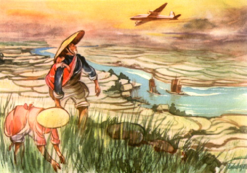 Noch einmal eine ziemlich kahle Berggegend an der Südgrenze von Schensi, dann sind sie über dem roten Becken von Szetschuan, aus dem alle Wasser nach dem oberen Jangtsekiang abfließen. "Szetschuan heißt ,Vier Flüsse', aber damit sind nur die vier größten gemeint. Tatsächlich hat das rote Becken wohl viermal hundert Flüsse. Szetschuan, die größte und reichste der 31 chinesischen Provinzen, ist so groß wie Deutschland und hat auch ebenso viele Einwohner." Dorrtsche weiß in der Erdkunde offenbar sehr gut Bescheid. An den Hügelhängen des Kialing=Flusses, über dem sie jetzt in geringerer Höhe dahinfliegen, ziehen sich Terrassenfelder mit Reis und Zuckerrohr, Orangen, Grapefruits und Tee, Tabak und Opium, Mais und Weizen hoch hin» auf. Manchmal bis an die Gipfel der Berge. In einem Gewirr von Flußarmen liegt Tschengtu, die Hauptstadt der Provinz. Sie ist wie Sianfu eine Halbmillionenstadt, aber hier erscheint alles viel freundlicher, grüner. "Die Stadt ist reich wie die Provinz. Die Salzquellen von Szetschuan versorgen fast ganz China mit Salz. Seine Fabriken liefern die beste chinesische Seide." Der Flugplatz ist groß und modern. |