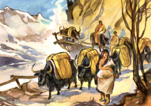 Der Abt und die Lamas essen Tsamba und Obst, sie trinken keinen Wein. Tsongkhapa, der Stifter der gelben Lamakirche, hat den Genuß von Alkohol verboten. "Den Tsamba, unser tibetanisches Nationalgericht, mußt du doch wenigstens probieren", sagt Dorrtsche zu Tom, der aufmerksam der Unterhaltung in chinesischer Sprache zugehört, aber nicht viel verstanden hat. Dorrtsche reicht ihm einen runden Holznapf, in dem etwas Tee, bräunliches Gerstenmehl und ranzige Jakbutter gemischt sind. "Knete es mit deinen Fingern gut durch und forme kleine Würstchen daraus! Du wirst dich wundern, wie gut das schmeckt." Tom tut, wie ihm geheißen und kostet ein wenig. Er hat eine feine Nase und eine Abneigung gegen Jakhaare. Höflicherweise läßt er sich nichts anmerken. Er lächelt und dankt. "Wenn ich nicht schon satt wäre, würde ich drei Schalen davon leer essen." Sie gehen bald zur Ruhe. Tom ist mit Dorrtsche zusammen in einer engen Lamazelle untergebracht. Er breitet seinen Pelzmantel über die Lehmbank und benutzt seine Pelzmütze als Kopfkissen. Morgen wollen sie früh aufbrechen. Eine Brücke über den Jangtse ist drei Stunden Ritts weiter nach Süden. Es ist noch die alte Karawanenbrücke, die nur für Tragtiere und nicht für Fahrzeuge gebaut wurde. Aber auf der anderen Seite soll ein Auto warten, das, in Teile zerlegt, dorthin getragen und wieder zusammengebaut worden ist. Und dieses Auto würde sie - so haben die chinesischen Beamten gesagt - in einem Tage bis nach Tschamdo bringen, 300 Kilometer! Dorrtsche scheint selbst nicht recht an diese Kunde zu glauben. "China schiebt sich immer tiefer nach Tibet hinein vor", sagt er mit einem tiefen Seufzer. Bald hört Tom sein unruhiges Schnarchen. |