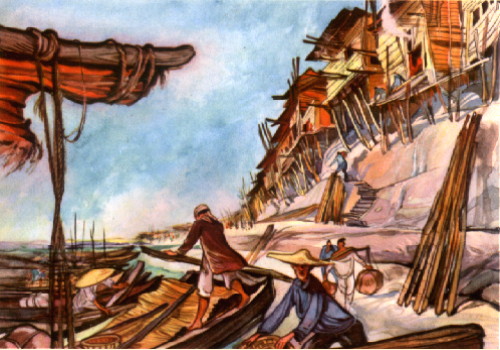 Zwei Tage später sind sie in Hankau, dem "Chikago von China". Obgleich diese große Handels= und Industriestadt noch rund tausend Kilometer von der Küste entfernt ist, liegen hier doch schon Ozeandampfer bis zu 10 000 BRT auf dem Strom. Dieser macht in seinem Mittel und Unterlauf zahlreiche große Windungen. An beiden Ufern sind riesige Deiche, über die man zur Zeit des winterlichen Niedrigwassers nicht hinwegschauen kann. Tom und Wang spielen mit dem Kapitän und dem Zahlmeister Mah=Jongg. Der Kapitän behauptet, daß sein Schiff zu Zeiten sommerlicher Überschwemmungen quer über die Deiche gefahren wäre und die Flußschleifen abgeschnitten hätte. Aber Tom weiß nicht, ob das nicht ein Seemannsgarn ist. Er genießt das faule Leben an Bord. Nach den Anstrengungen des Rittes hat er Ruhe nötig. Von Deck gibt es außer Möwen, Dschunken und Dampfern nicht viel zu sehen. Nur zwischen Nanking und Pukau steht Tom vom Mah=Jongg=Tisch auf, und als der Flußdampfer tutend das Schanghaier Elektrizitätswerk passiert, steht er winkend neben Wang an der Reling. |