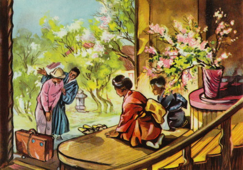 Nakamura=san. "Das ist ein kleines Übel unseres wohltätigen Bades. Das Silber kann unten wieder blankgeputzt werden, aber die Rheumaschmerzen, die wir hier kurieren, kehren nicht wieder." Von der Busstation haben sie nur einen kurzen Weg zu Herrn Nakamuras Haus. Es ist mitsamt dem dazugehörigen Garten von einem übermannshohen Holzzaun umgeben; er hat nie einen Farbanstrich getragen, man sieht deutlich die Maserung der sonnengebleichten Kiefernbretter. Das Haus dahinter ist nicht viel höher als der Zaun; sein flaches Dach ragt nach allen Seiten weit über die hölzernen Wände hinaus. Ein paar Schritte durch den mit sauberen Felssteinen und bizarren Zwergtannen geschmückten Vorgarten, dann stehen sie vor der Haustür, die ebenso wie das Gartentor weder Schloß noch Griff hat. Nakamura=san klatscht in die Hände, dann wird die Schiebetür zur Seite geschoben. Das Hausmädchen hat geöffnet. Frau Nakamura kniet im Vorraum des Hauses vor einer weiteren Schiebetür auf einer kniehohen, glänzend polierten Stufe und verbeugt sich vor ihrem Mann und seinem Gast. Die Herren verbeugen sich gleichfalls. Hände werden nicht geschüttelt. Vor der hölzernen Stufe ist der Vorraum betoniert, hier stehen wohl ein Dutzend Paare Getas und Schuhe. |