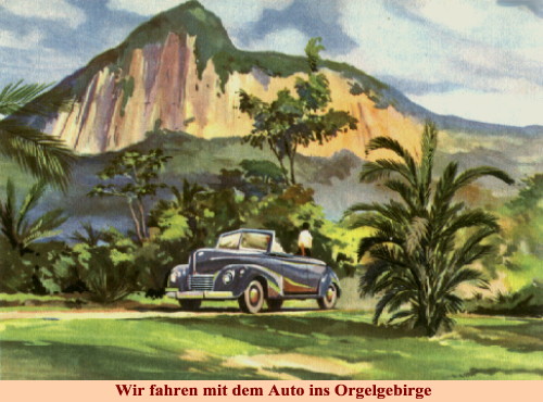 Wir fuhren mit dem Auto ins Orgelgebirge "Jetzt wird nicht umgekehrt", meinte Fernandez, "nun wollen wir auch bis auf den Gipfel des Itatiaya." Dieser Berg ist der höchste in Brasilien, fast 3000 m über dem Meeresspiegel. Aber wir waren schon reichlich müde und mieteten uns deshalb ein Auto. Oben bot sich uns ein herrlicher Anblick: das wildzerklüftete Orgelgebirge - schroffe Felsen und tiefe Täler mit all den Geheimnissen einer unbekannten Landschaft. |