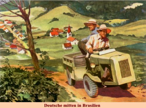 Deutsche mitten in Brasilien Fernandez und ich machten noch einen Abstecher nach Süden. Wir kamen in ein Dorf mit richtigen behäbigen deutschen Bauernhöfen- Zwei Männer fuhren zur Feldarbeit, sie unterhielten sich in deutscher Sprache und erzählten uns dann, daß der Boden fruchtbar und der Ertrag gut sei. Sie priesen ihre klugen Großväter, die sich auf der Suche nach einer neuen Heimat hier niederließen. |