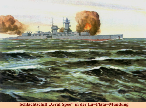 "Graf Spee" Das nach dem Admiral des Ersten Weltkriegs benannte Schlachtschiff. Der Admiral ging mit seinem Flaggschiff Scharnhorst im Dezember 1914 bei den Falklandinseln unter. Das Schlachtschiff "Admiral Graf Spee" versenkte sich im Zweiten Weltkrieg nach einem Gefecht mit britischen Kreuzern am 17. Dezember 1939 in der La=Plata=Mündung |
