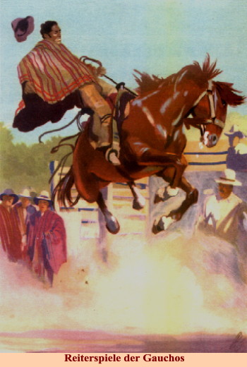 Reiterspiele der Gauchos Mit allen Vieren schnellt sich das backende Pferd hoch in die Luft! Und dabei hält der Gaucho sich nur mit einer Hand am Zügel fest. Den Hut verliert er, aber diese Männer verstehen sich so gut auf das Reiten, daß auch der störrischste Gaul sie nicht aus dem Sattel bringt. Zu festlichen Anlässen versammeln sich die Gauchos, die sonst verstreut auf den Pampas bei ihren Rinderherden leben, und veranstalten Reiterspiele, bei denen jeder seine Künste vorführt. |