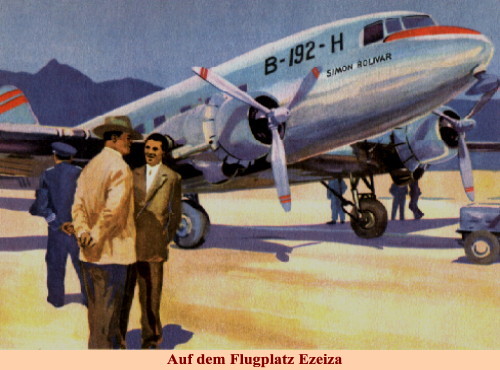 Auf dem Flugplatz Ezeiza Buenos Aires ist die drittgrößte Stadt von ganz Amerika - nach New York und. Chicago. Hier gibt es Großstadtstraßen;, die 120 Meter breit sind. Über eine Superautobahn sind wir nach dem Flughafen Ezeiza gebraust, vielleicht dem modernsten Flughafen, der heute in Betrieb ist. Ringsherum ist ein richtiger Kurort entstanden. Allein drei Schwimmbäder gibt es dort. |