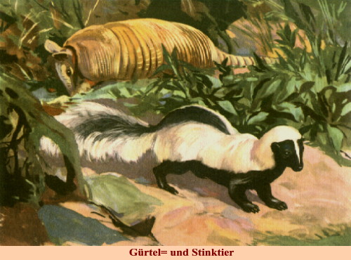 Gürtel und Stinktier Die Gürteltiere, von denen es verschiedene Arten gibt, sind Insektenfresser mit einem Schuppenpanzer. Das Stinktier oder Skunks ist ein Raubtier und mit dem europäischen Dachs verwandt. |