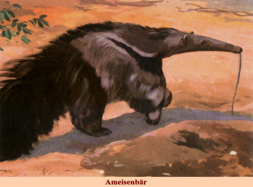 Ameisenbär Da kam plötzlich ein komischer Vierbeiner, mit langem Rüssel, buschigem Schwanz und langen Krallen an den Vordertatzen, schnüffelnd um die Ecke, Ein Ameisenbär! Er war ganz zahm. Die Indianerfrauen warfen ihm rohe Fleischstücke zu. Das schienen Leckerbissen für den Burschen zu sein, der von den Indianern als Haustier gehalten wurde, um das Ungeziefer zu vertilgen. |