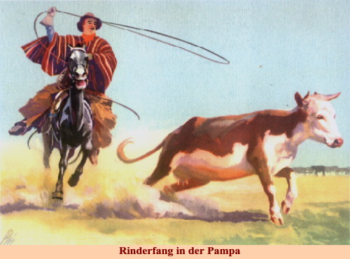 Rinderfang in der Pampa Die Gauchos sind verwegene Gesellen. Bereitwillig führten sie uns ihre Reit- und Lassokunststücke vor. Bis zu zwanzig Meter ist solch ein Lasso lang. In gestrecktem Galopp jagten die Hirten, mit gellenden Rufen das Lasso über dem Kopf schwingend, hinter den aufgeregt flüchtenden Rindern her. Ein letzter Schwung - ein Ruck - ein Zuck: das Tier war gefangen! Wir klatschten Beifall Mit Grandezza schwenkte der Gaucho seinen Hut. |
