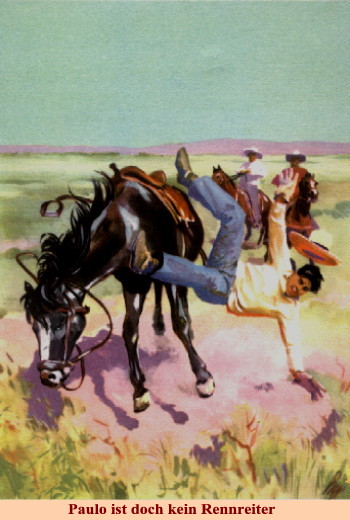 Paulo ist doch kein Rennreiter Im hohen Bogen fliegt Paulo hier aus dem Sattel seines Pampaspferdes. Krampfhaft hat er sich auf dem wild bockenden Tier festgehalten, bis er Zaum und Steigbügel verlor. Dieser Fall war gar nicht so harmlos und kostete ihn einige gebrochene Knochen. Von da an verzichtet er dankend auf alle weiteren Ausritte. |