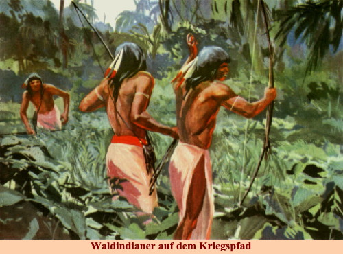 Waldindianer auf dem Kriegspfad Mancherlei Gefahren warfen auf den ahnungslosen Weißen, der zum erstenmal den geheimnisvollen Urwald betritt. Die Waldindianer aber sind hier zu Hause. Ihre scharfen Augen haben blitzschnell jeden Gegner entdeckt, und ihren Ohren entgeht kein Geräusch, das auf eine Gefahr aufmerksam machen könnte, die irgendwo im undurchdringlichen Urwalddickicht auf sie lauert. Die Guarani sind geübte Bogenschützen, und ihre Pfeile mit dem tödlichen Curaregift verfehlen fast nie ihr Ziel. |