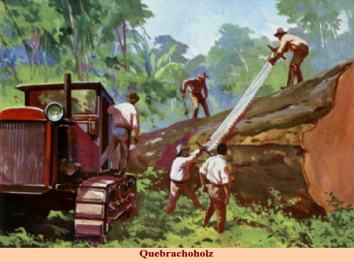 Holzfäller bei Ihrer schweren Arbeit im Urwald Wieder ist ein Quebracho geschlagen. Die Männer atmen auf: denn es ist eine gefährliche Arbeit, diese Urwaldriesen von oft 100 m Länge und 5 m Dicke zu fällen. Der Name Quebracho bedeutet Axtbrecher. Daran erkennt man schon, wie hart das Holz ist. Diese Bäume sind oft jahrhundertealt. - überall sind Sägemühlen im Entstehen, die den Holzreichtum Argentiniens für die Menschen nutzbar machen. |