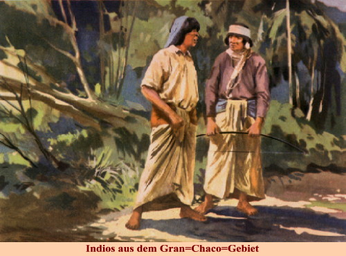 Indios aus dem Gran-Chaco-Gebiet Onkel Tom mußte bei seinem Flug über die Sierra Cordobo auch den berühmten Gran Chaco überqueren - Chaco heißen die Urwälder und Savannen im Norden Argentiniens. Es ist ein düsteres, einsames Waldgebiet, wohin sich die letzten Indianerstämme, die einst auch die weiten Pampas durchstreiften, zurückgezogen haben. Es sind sehnige Gestalten, diese Indios, mit blauschwarzem Haar und schlauen, grünen Augen. |