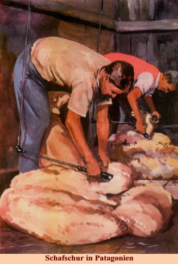Schafschur in Patagonien Hier werden 17 Millionen Schafe gehalten, die bei jeder Schur bis zu 60 000 Tonnen Wolle liefern. Mit elektrischen Scheren werden die Tiere geschoren, die diese Prozedur nur widerwillig über sich ergehen lassen. |