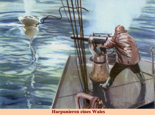 Walfang Von den Walfangschiffen aus werden die Wale heute mit der Harpunenkanone geschossen. Die erlegten Tiere werden zum Walfangmutterschiff geschleppt, das eine modern eingerichtete Kocherei mit allen technischen Anlagen an Bord hat, um die Wale schnell verarbeiten zu können. |