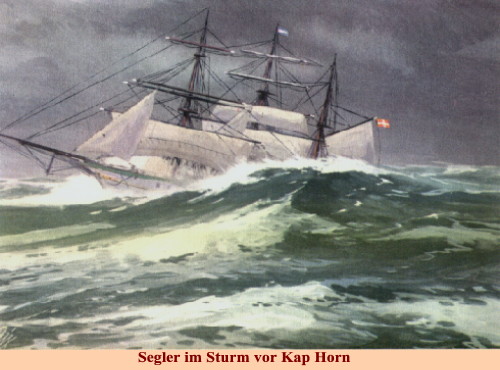 Im Sturm von Kap Hoorn Haushoch türmen sich die Wellen vor diesem Segler auf der Reise um Kap Hoorn. Das ist für die Schiffahrt eine der gefährlichsten Ecken der Welt. Hier stürmt es fast das ganze Jahr hindurch, und obendrein herrscht eine gewaltige, nach Osten drängende Strömung. Vielen Schiffen ist Kap Hoorn zum Verhängnis geworden. Wer sich auf eine Reise um Kap Hoorn röstet, muß sich auf allerhand gefaßt machen und wird immer froh sein, wenn er das Kap hinter sich weiß. |