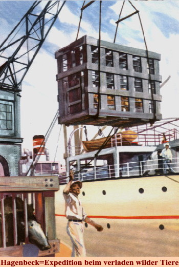 Hagenbeck-Expedition beim verladen wiider Tiere Als wir in den Hafen von Bahia Bianca kamen, wurde gerade ein großer Tiertransport für Hagenbeck vorbereitet, überall standen Käfige und Kisten herum. Die Tiere knurrten und fauchten und sprangen zähnefletschend gegen die Gitterstäbe, sobald wir uns ihnen näherten. Soeben wurde ein Käfig mit zwei Pumas an Bord gehievt. |