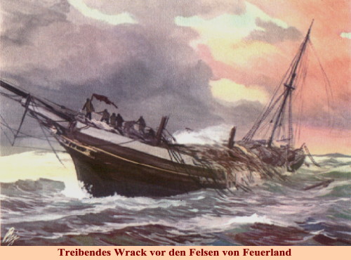 Treibendes Wrack vor den Felsen von Feuerland Die Segel zerfetzt, die Masten geborsten, so treibt dieses Schiff hilflos in der tobenden See. Die Hälfte der Mannschaft hat der Sturm bereits über Bord gefegt. Auf Deck ein letzter, verzweifelter Kampf gegen Sturm und Wogen. Wie lange noch, bis das Wrack an den Klippen zerschellt? |