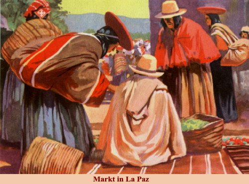 Markt in La Paz Ein buntes, malerisches Treiben auf dem alten Marktplatz von La Paz. Phantastische Gestalten! Die Männer in grellbunten Ponchos und halblangen Hosen, die Füße nackt oder in Holzpantinen. Kupferbraune Gesichter, kohlschwarze Haare und bunte, gestrickte Mützen, auf denen manchmal auch noch ein heller Filzhut sitzt; denn auf der Hochebene ist es kalt! Die Frauen wirken wie riesige Farbkleckse vor ihren großen Obst und Gemüsekörben. |
