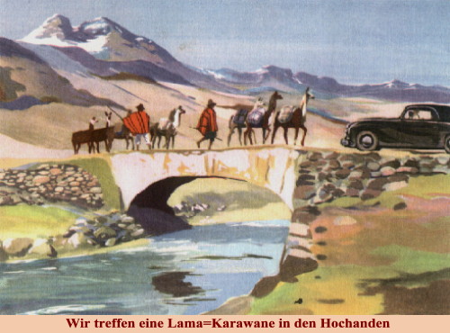 Wir treffen eine Lamakarawane in den Hochanden In gelbe Staubwolken eingehüllt, ziehen Lamakarawanen an uns vorüber. Oft Hunderte von Tieren; hinter ihnen zu Fuß oder auf Mauleseln die indianischen Treiber, den bunten Poncho über der Schulter und die Satteltasche mit geröstetem Mais als Reiseproviant gefüllt. Verwegene, verwitterte Gestalten sind diese Karawanenführer - echte Caballeros der einsamen Landstraßen! Allein möchte ich ihnen nicht begegnen. Sie sehen aus, als ob sie mit einem Gringo nicht viel Federlesens machen. |