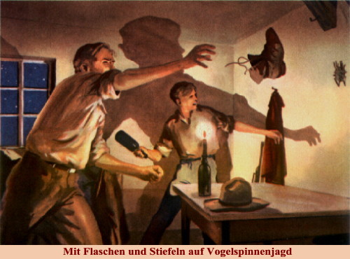 Mit Flaschen und Stiefeln auf Vogelspinnenjagd Caracho! Welch ein Ungeheuer kriecht da über die Wand! Eine faustgroße Vogelspinne mit behaarten Beinen und zwei langen krummen Zähnen am aalglatten Bauch. Onkel Tom greift schnell nach seinem Stiefel und bringt das Untier mit einem wohlgezielten Wurf zur Strecke. Glück gehabt... Die Vogelspinne gehört zu den giftigsten Spinnen der Welt. |
