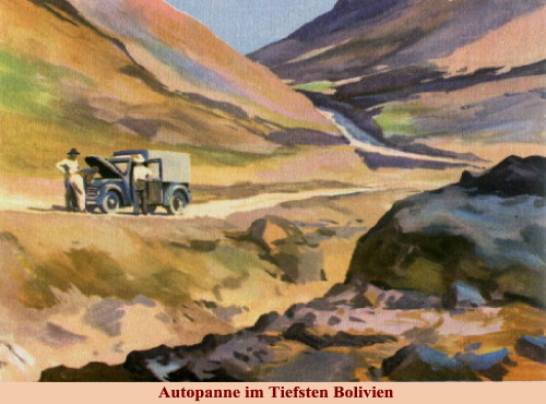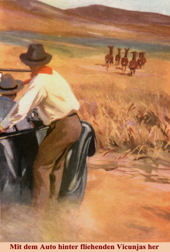 Im Auto hinter Vicunjas her Beilage zum letzten Brief. Das Postflugzeug kommt erst übermorgen. Also kann ich Dir noch einen Kurzbericht geben. Onkel Tom hat sich bei einer nordamerikanischen Firma in La Paz einen Wagen geliehen. Wir wollen ostwärts nach Santa Cruz fahren, wo das Land niedriger wird, bis es allmählich in Tiefland übergeht. Onkel Tom wollte aber erst einmal den Wagen ausprobieren. Deshalb haben wir gestern eine kürzere Tour in die Berge unternommen. So ungefähr bis in Montblanc=Höhe sind wir gefahren. Man merkte es dem Wagen an, daß ihm auch bald die Puste ausging - wie uns. Es war eine verwegene Fahrt. Ringsum Felseneinöde, aber in leuchtenden Farben strahlend, je höher wir kamen. Ein schneidender Wind fegte uns entgegen. Trotz dicker Wollsachen froren wir wie die Schneider. Menschen wohnen in diesen Höhen nicht mehr. Einmal stand eine verlassene Steinhütte am Weg, wohl von indianischen Hirten oder Karawanenführern erbaut. Auf der Hochfläche, die man hier Puna nennt, gelbliche Grasflächen und weit hinten eine Herde äsender Vicunjas. Das sind die wild lebenden Verwandten der Lamas, gelblichbraun bis kupferrot, so daß man sie ohne Glas kaum von der Landschaft unterscheiden konnte. Wir fuhren vorsichtig näher, zeitweise durch Felsen gedeckt. Aber als wir auf die freie Fläche hinauskamen, stob die Herde davon. Unser Wagen konnte das Tempo nicht durchhalten. Der Abstand wurde schnell größer. Schon waren sie in einer Schlucht verschwunden. Gefährliche nächtliche Abenteuer Unsere Autofahrt ins bolivianische Tiefland wäre fast schiefgegangen. |