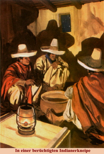 In einer berüchtigten Indianerkneipe Rauher Gesang und Stimmengewirr, Irgendwo in der Nähe bellten Hunde. Als wir in die Tür traten, saßen wilde, verwegene Gestalten um einen großen Topf, aus dem es scharf säuerlich roch, "Buenos noches Senores!" Sie blickten auf. Wüste betrunkene Gesichter.... uns war recht unheimlich zumute, als wir die schmutzige Indianerin um Nachtquartier baten. War es überhaupt ratsam, mit diesen Betrunkenen zusammen zu übernachten? |