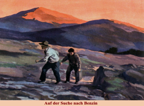 Auf der Suche nach Benzin Unser Mißtrauen wuchs, irgendwo schien eine Falle zu lauern. Also schnell Beschluß gefaßt: Onkel Tom blieb mit dem Fahrer beim Wagen, Fernandez und ich sollten losgehen und noch vor Einbruch der Nacht eine Siedlung erreichen, um Benzin zu beschaffen. Wir zwei marschierten los. Es wurde ein langer und gefährlicher Weg. |