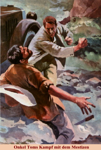 Der war über die nächtlichen Gäste nicht schlecht erstaunt, hatte aber gute Nachrichten für uns. Morgen kam ein Lastwagen aus der Stadt. Der hatte gewiß etwas Benzin übrig. Der Bürgermeister wollte uns einen zuverlässigen Führer mitgeben und Maultiere zum reiten. Zweikampf auf Leben und Tod Am andern Tag brachen wir auf, erfrischt und wohlversehen mit Führer, Maultieren und Benzin. Es ging auf kürzerem Wege zurück zu dem Platz, wo Onkel Tom und der Fahrer auf uns warteten. Noch eine Wegbiegung. Ja, dort stand der Wagen. Onkel Tom kletterte heraus, kam uns entgegen, einen Arm dick verbunden. Begrüßung und Fragen. "Come and see!" Wir gingen zum Wagen. Im hinteren Teil lag der Fahrer, an Händen und Füßen gefesselt. Nanu, was sollte denn das bedeuten? Nun, Onkel Tom hatte vorn im Wagen gesessen, die entsicherte Pistole in der Tasche, der Fahrer hatte sich hinten in den Wagen gelegt. Nach kurzer Zeit schnarchte er laut. Auch Onkel Tom nickte ein. Es war stockdunkel geworden. Plötzlich fährt er wieder hoch. Was klapperte da eben hinter ihm? Wie er sich umdreht, sieht er, wie sich der Fahrer an unserem Gepäck zu schaffen macht. Onkel Tom springt hoch, der Fahrer versucht zu flüchten. Tom Smith erwischt ihn am Arm. Da zieht der Bursche blitzschnell sein Messer und sticht zu. Aber Onkel Tom versetzt ihm einen Faustschlag ins Gesicht, daß er zusammensackt. Es hat alles nur Sekunden gedauert im nächtlichen Dunkel. Tom fesselt den Kerl dann und schleppt das ohnmächtige Bündel in den Wagen und bindet ihn dort fest. Dann macht er sich einen Notverband am Arm. Die Verletzung scheint nicht schlimm zu sein. Es beginnt zu dämmern. Onkel Tom steckt sich eine Pfeife an, setzt sich vorn in den Wagen und wartet auf uns. |