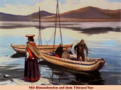 "Yes, that' sall!"- Wir fuhren los. Fernandez saß am Steuer. In der nächsten Stadt lieferten wir den gefesselten Fahrer, der inzwischen wieder zu sich gekommen war und uns heimtückisch anblinzelte, im Polizeigefängnis ab. Hoffentlich wird er dort eine Zeit eingelocht. Der Polizeidirektor hat es versprochen: "Ganz gewiß, Senores!" Im Binsenboot auf dem Titicaca-See Lieber Jupp, wir haben unsere Autoreise nach Santa Cruz aufgegeben. Onkel Toms Arm ist zwar ausgeheilt. Aber nach der "Autopanne" will er nichts mehr von Bolivien wissen. Wir sind deshalb von Cochabamba aus nordwestlich gefahren - zum Titicaca-See, der zum größeren Teil schon zu Peru gehört. Und nun muß ich schon wieder eine echt amerikanische Angabe machen: Dieser See ist der höchstgelegene der Erde. Er liegt ungefähr gleich hoch wie La Paz. Der Dampfer, mit dem wir über den See wollten, ging erst nachts. So blieb genug Zeit, die seltsamen Fahrzeuge der Indianer zu besichtigen. Wir sind sogar mit einem solchen Binsenboot ein Stück auf den See hinauszufahren. |