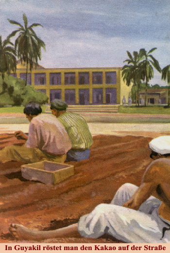 In Guayaquil röstet man des Kakao auf der Straße Wie in allen großen Städten Südamerikas ist auch hier ein toller Verkehr auf den Straßen. Aber in Guayaquil wurde nur eine Fahrbahn benutzt. Auf der anderen hockten Neger und trockneten riesige Mengen von Kakaobohnen mitten auf der Straße. Kakao war der Reichtum des Landes, bis eine Pilzkrankheit die Bestände zerstörte. Aber man fand Mittel, um diese Krankheit zu bekämpfen, und heute steigt wieder der Kakaoanbau von Jahr zu Jahr. |