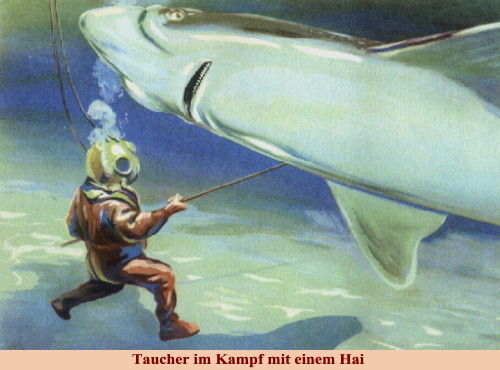 Taucher im Kampf mit einem Hai Unser Flugzeug flog dicht über dem Wasser. Unter uns erkannten wir dunkle dahinschießende Striche - wahrscheinlich die großen Hammerhaie. Ich dachte an die gefährlichen Begegnungen der Taucher mit diesen unheimlichen Gesellen. Mut und Geschicklichkeit sind notwendig, um die mächtigen Tiere zu erledigen. |