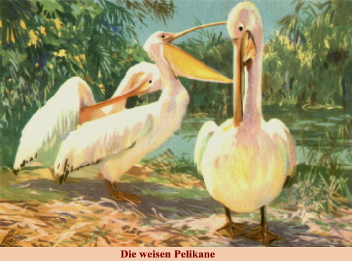 Pelikane Unter den vielen Wasservögein, die ich vorn Flugzeug aus beobachten konnte, gefielen mir am besten die Pelikane. Es sah drollig aus, wenn diese wuchtigen Vögel mit den eigenartigen Schnäbeln ihr prächtiges Gefieder putzten. Im Wasser sind die Pelikane gewandte Taucher und Schwimmer. |