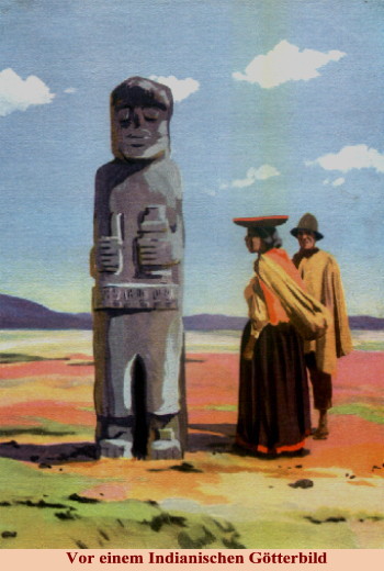 Vor einem indianischen Götterbild Auf der peruanischen Hochebene stehen riesige steinerne Götterbilder, zu denen noch heute die Eingeborenen in Ehrfurcht aufblicken. Sie sind uralte Zeugen einer gewaltigen Kultur und Religion und großartiger Staaten und Reiche, in denen die Sonne als oberste Gottheit verehrt wurde. Als wir weiter ins Land kamen, entdeckten wir immer mehr dieser Standbilder und schließlich Burgen und Tempelbauten, die man nur bewundernd anstaunen kann. |