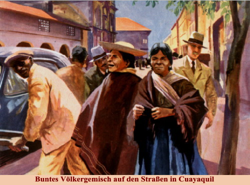 Buntes Völkergemisch auf den Straßen von Guayaquil Hier treffen sich Neger und Mulatten, Indianer und Mestizen, Europäer und Asiaten. Modernste Autobusse neben Holzkarren, vor denen Eingeborene schwitzen. - Sich in diesem Wirrwarr von Sprachen zurechtzufinden, ist eine Kunst. Onkel Tom beherrscht sie großartig. |