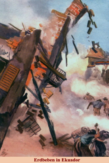 Erdbeben in Ekuador Wir können uns so ein Erdbeben gar nicht richtig vorstellen. Unheimlich ist das Auflehnen der Natur, wenn die Erde aufreißt, gähnende Spalten sich bilden, ganze Städte und Dörfer zusammenfallen und Menschen und Tiere unter ihren Trümmern begraben. |