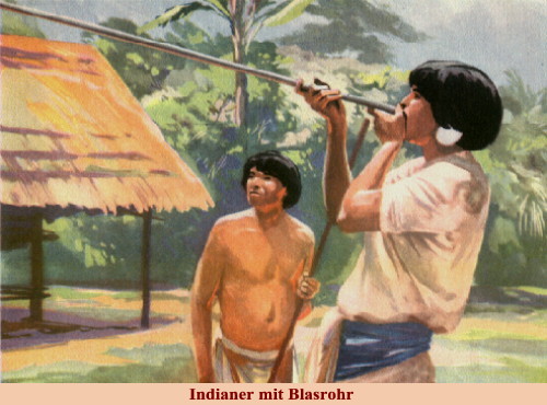 Indianer mit Blasrohr So ein Blasrohr ist eine tolle Sache, ich habe es mir von einem Indianer vorführen lassen. Ein glattes Holzrohr, 1-2 m lang, darüber eine Schutzhülle. Man kann damit kleine Tonkugeln und Pfeile abschießen. Das ist aber keine bloße Spielerei. Die "Geschosse" sind vergiftet, und die Indianer benutzen die Blasrohre als Jagd- und Kriegswaffen.. |