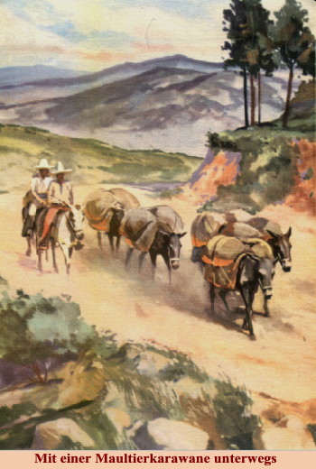 Mit einer Maultierkarawane unterwegs Wir haben uns einer Portida, einer Maultierkarawane, angeschlossen. Der Transportführer, den man hier Arriero nennt, war gleich einverstanden. Wir schienen ihm als Begleiter seiner Karawane ganz willkommen zu sein. Mindestens fünfzig Kilometer haben wir am Tag geschafft. Abends hielten wir bei einer Posada an. So heißen hier die einfachen Gasthäuser, ich legte mich gleich hin und war sofort eingeschlafen, als draußen ein wüster Lärm entstand |