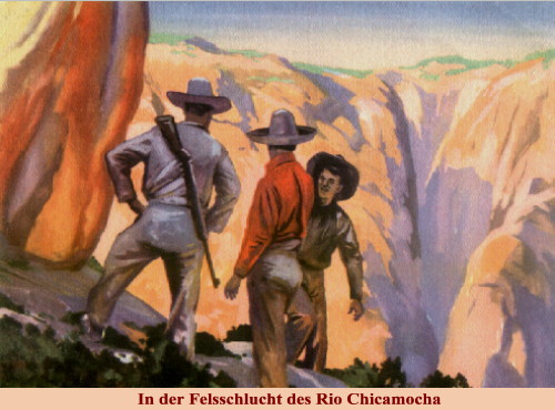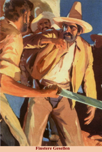 Fragen. "Sind hier drei ,Caballeros' vorbeigekommen?" "Ja, dort hinauf sind sie!" Aber die Dunkelheit hatte sie längst verschlungen. Und auf der Straße blieben die bestimmt nicht. - Die Soldaten erzählten. Sie hatten zu fünft einen Goldtransport begleitet, als Bewachung. Während einer Rast hatten sie den Arriero mit den Mulas allein gelassen, um ein bißchen auf die Jagd zu gehen. Caramba, wer konnte ahnen, daß der Arriero inzwischen überfallen wurde. Wie sie zurückkamen, lag der Transportführer gefesselt am Boden. Drei Mulas fehlten samt ihren Traglasten. Nun, das weitere konnten wir selbst erraten. Zwei Soldaten waren beim Transport geblieben, die anderen hatten die Verfolgung aufgenommen. Zu Pferde waren sie schneller als die Räuber. Die hatten, als die Verfolger nahten, die Mulas stehengelassen und sich seitwärts in die Büsche geschlagen. Ja, vermutlich waren sie ihnen endgültig entwischt. Aber wer weiß, morgen früh sollte die Verfolgung fortgesetzt werden. |