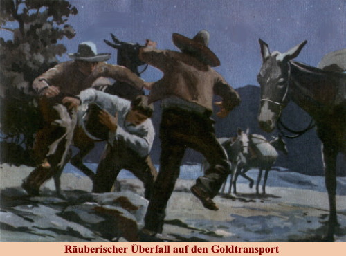 Räuberischer Überfall auf den Goldtransport Die Soldaten erzählten. Sie hatten zu fünft als Bewachung einen Goldtransport begleitet. Während einer Rast hatten siech den Arriero mit den Mulas alleingelassen, um ein bißchen auf die Jagd zu gehen. Caramba, wer kannte ahnen, daß der Arriero inzwischen überfallen wurde! Als sie zurückkamen, lag der Transportführer gefesselt am Boden. Drei Mulas samt ihren Traglasten fehlten. |