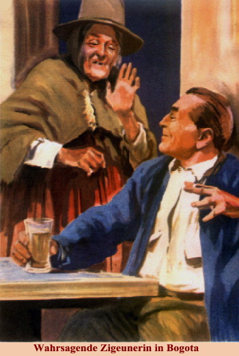 Wahrsagende Zigeunerin in Bogotá Wir sitzen in einem der vielen Cafés in Bogotá. Vor einer halben Stunde war ein Degenschlucker da und führte seine Künste vor. Jetzt bemüht sich Onkel Tom vergeblich, eine Zigeunerfrau wieder loszuwerden, die sich an unseren Tisch gedrängt hat und ihm aus der Hand wahrsagen will. |