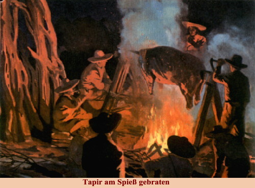 Tapir am Spieß gebraten Als wir zur Posada zurückkamen, war ein Soldat dabei, im Freien ein mächtiges Feuer zu machen. Die anderen beiden waren zurückgeritten, um ihre Jagdbeute zu holen. Sie hatten einen Bergtapir erlegt. Es wurde noch ein zünftiges Festessen in dieser Nacht. Das Feuer prasselte. Das Fett tropfte in die Flammen. Uns lief das Wasser im Munde zusammen. Als der Braten fertig war, haben wir alle kräftig reingehauen. |