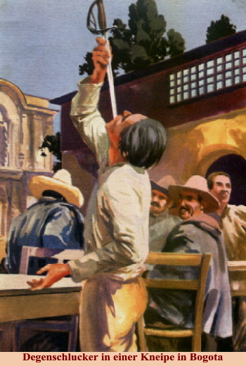 Degenschlucker in einer Kneipe in Bogota Wenn ich an unser Abenteuer mit den kolumbianischen Wegelagerern in der einsamen Posada denke, kommt es mir doch seltsam vor, daß wir heute friedlich in der Hauptstadt Bogota sitzen und einem Degenschlucker zuschauen. |