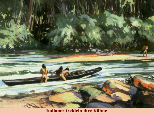 laden stromabwärts glitten. Stromauf ist das aber eine mühselige Sache. Indianer müssen die Kähne an Seilen vom Ufer aus ziehen. Eine sehr schwere Arbeit in der brütenden Hitze! |