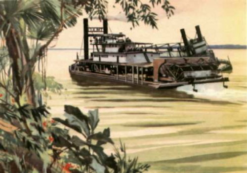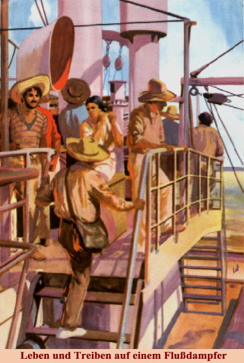 Leben und Treiben auf einem Flußdampfer Die Flußdampfer sind alle recht vorsintflutliche Fahrzeuge. Das Promenadendeck befindet sich auf einem Aufbau, hier haben auch Onkel Tom, Fernandez und ich unsere Kabine. Unter dem Deck halten sich die Eingeborenen auf. Dort herrscht ein buntes Durcheinander von Kisten, Fässern, Säcken und unaufhörlich schwatzenden Männern und Frauen. |