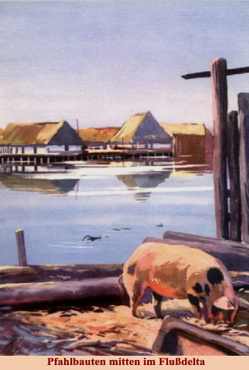 Pfahldorf im Flußdelta Das Dorf ist weit ins Wasser hineingebaut; denn dort gibt es keine Moskitos. Wir fahren mit dem Boot durch das Dorf, im Unrat vor den Häusern wühlen die Schweine,, laut gackernd flüchtet das, Hühnervolk. Die Dorfköter kläffen hinter uns her, und gaffend bestaunen uns die Indios. |
