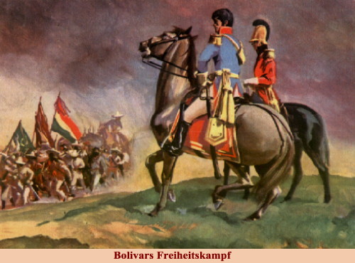 Bolivars Freiheitskampf Südamerika den Südamerikanern! Das war das Lebensziel, für das Simon Boiivar kämpfte. Es kam zu blutigen Schlachten mit den Spaniern, Und es ist einzig und allein das Verdienst dieses großen Mannes, daß Südamerika heute kein Kolonialgebiet der Europäer mehr ist. |