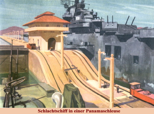 Schlachtschiff in einer Panamaschleuse Flugzeugträger und Schlachtschiffe - auch sie gelangen durch die berühmte Kanalanlage von Panama von einem Ozean in den anderen. Über gewaltige Schleusentreppen "klettern" die Schiffsriesen von einem Meeresspiegel zum anderen. Der Kanal ist ein Garant der Weltmacht der Vereinigten Staaten. Ein tolles Gedränge herrscht in den Kanalausgängen - und die größten Schiffe kommen heute gerade noch durch. |