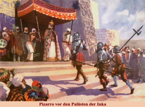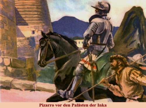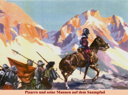 Pizarro vor den Palästen der Inkas Unmittelbar nach der Landung an der unwirtlichen Westküste begannen die Spanier den beschwerlichen Andenaufstieg. Was Pizarro mit einer Handvoll Spanier auf dem Marsch vollbrachte, das kann man nur mit Hannibals Alpenübergang vergleichen. Wie geblendet sahen die Spanier und ihr Feldherr endlich von der erreichten Höhe herab auf die Festungen und Städte der Inkas. |