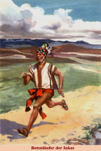Botenläufer der Inkas Alarm - Alarm im ganzen weiten Inkareich! Stafettenläufer jagen auf den großen Straßen nach Süden und Norden. Der Feind ist im Land! Der Herrscher ist gefangen! Die Spanier beginnen die Schätze zu plündern! Und in wenigen Tagen gelangt die Unglücksbotschaft von einer Hauptstadt zur anderen, tausend Kilometer weit. Die hervorragend angelegten Straßen mit ihren Rasthäusern und gewaltigen Brücken leisten wieder einmal beste Dienste. |